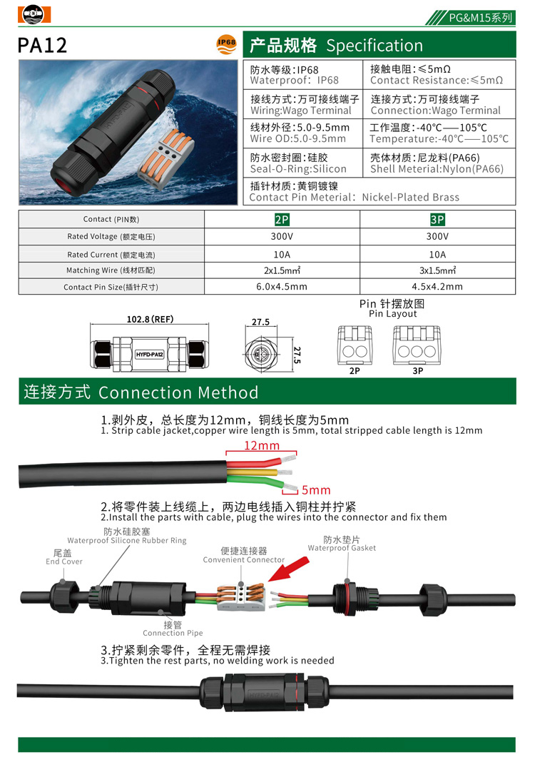| Materyal | Flame-retardant PA66 Pabahay, hindi kinakalawang na asero na tagsibol |